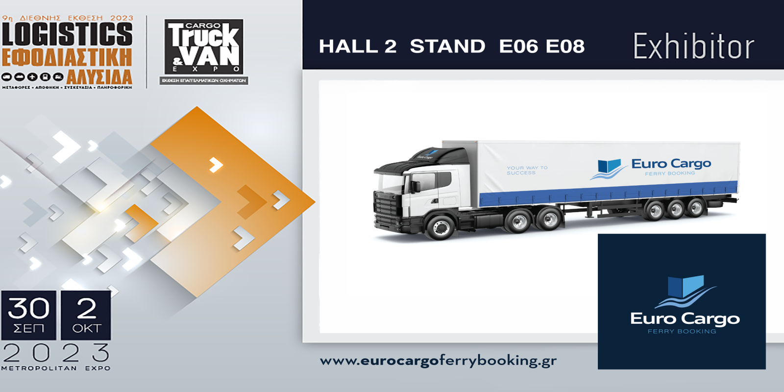 Με χαρά σε καλούμε να επισκεφθείς την 9η έκθεση «Εφοδιαστική Αλυσίδα & Logistics» – 4η «Cargo Truck & Van Expo», στην οποία η εταιρεία μας EURO CARGO FERRY BOOKING συμμετέχει και πραγματοποιείται στο εκθεσιακό κέντρο METROPOLITAN EXPO στις 30/9 – 02/10!